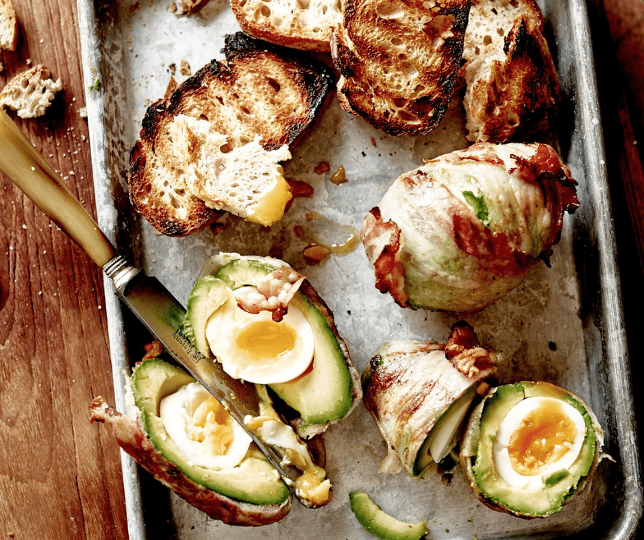 Leg de avocado’s op de grill en bak tot het spek knapperig is. Draai de avocado’s geregeld even rond.