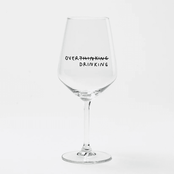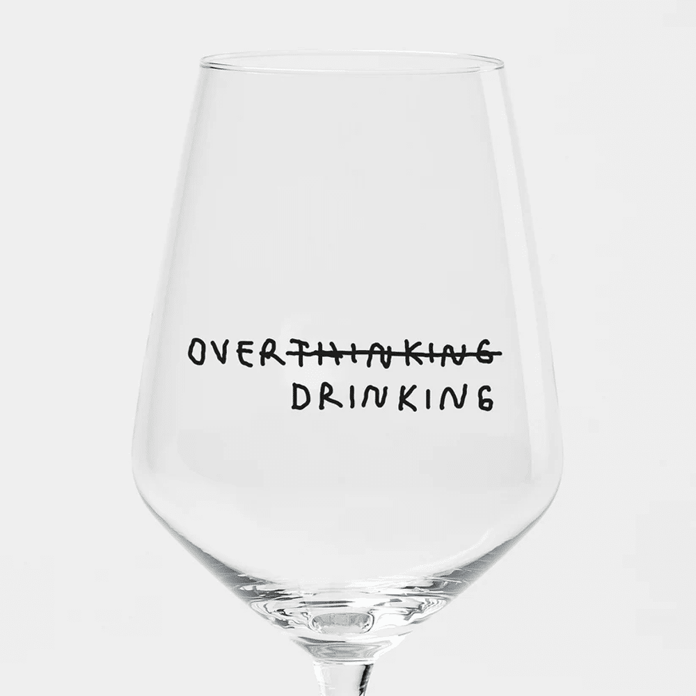 Wijnglas met de opdruk "Over Thinking". Uw nieuwe partner voor spritz, witte wijn, rode wijn en rosé. Uit de gezamenlijke collectie van illustrator Johanna Schwarzer uit Offenbach & selekkt.