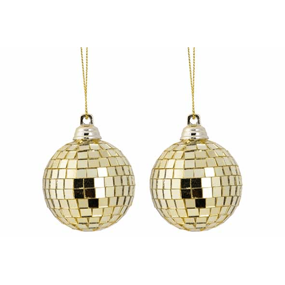 Deze set van 2 gouden disco kerstballen van 5 cm diameter voegt een sprankelend accent toe aan elke kerstboom of feestdecoratie. De ballen zijn gemaakt van lichtgewicht kunststof en hebben een reflecterende facetafwerking die het licht op een feestelijke manier weerkaatst.