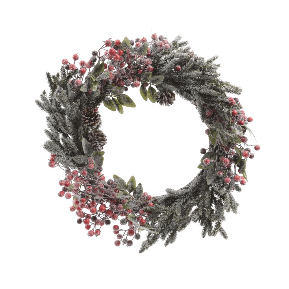 Everlands 40 cm Frosted Krans Deze prachtige Everlands krans is perfect voor het toevoegen van een vleugje kerstmagie aan een interieur. Speciaal ontworpen voor gebruik binnenshuis, biedt deze krans een warme en uitnodigende uitstraling met een natuurlijke afwerking. Met een diameter van 40 cm en een hoogte van 9 cm, is deze krans gemaakt van hoogwaardig PE-materiaal en fraai afgewerkt met een frosted look. De decoratieve rode bessen, dennenappels en natuurlijke wilgentakken geven de krans een klassieke en feestelijke uitstraling. Deze onbelichte krans is ideaal voor wie de voorkeur geeft aan een eenvoudiger ontwerp zonder verlichting, waardoor de natuurlijke charme van de materialen en decoraties volledig tot hun recht komen. - Diameter van 40 cm - Fraaie afwerking met frosted effect - Decoraties: rode bessen en dennenappels - Gemaakt van stevig PE-materiaal - Speciaal voor binnenshuis gebruik Breng de sfeer van het seizoen in huis met deze fantastische krans van Everlands.