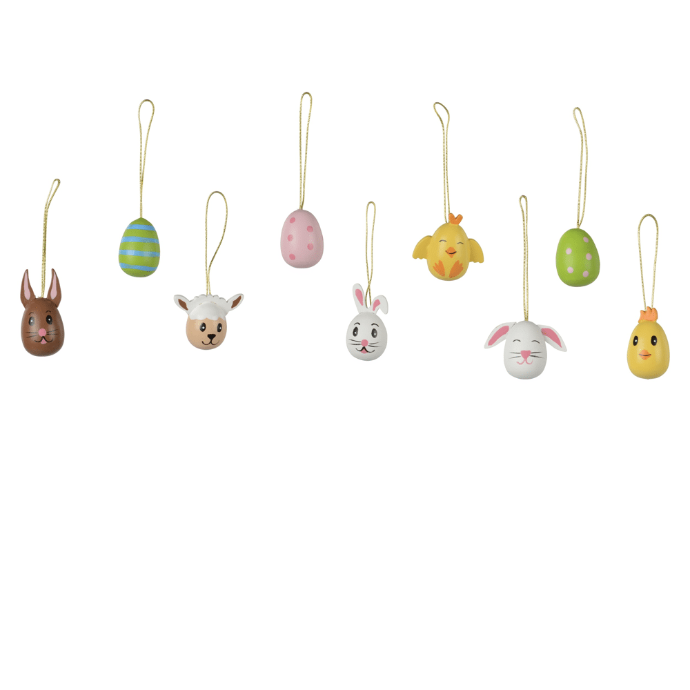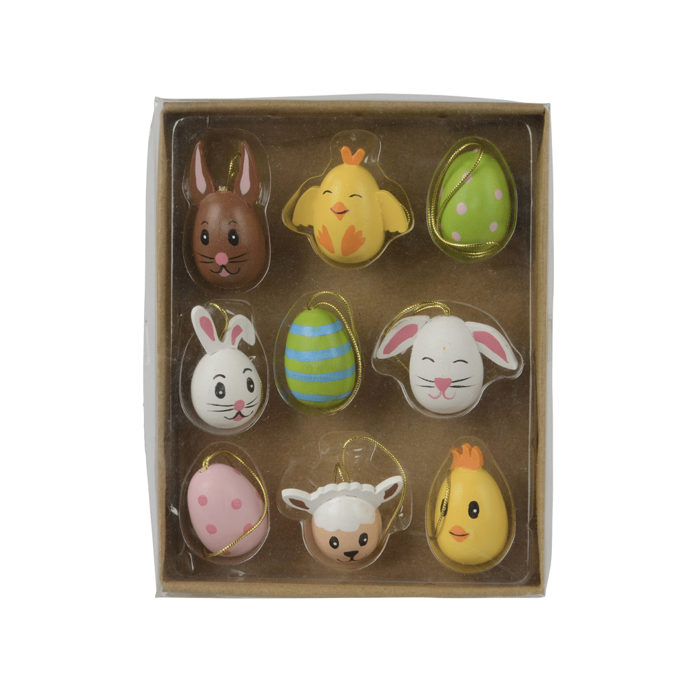 Decoris Pasen eierenset multicolor houten hangdecoratieBreng een warme lentestemming in je Home met deze kleurrijke set Decoris Pasen eieren. Deze set van negen kleine houten eieren, elk ongeveer 3 cm groot, combineert vrolijke ontwerpen van konijntjes, kuikentjes en unieke stip- en streepjespatronen. Dankzij de goudkleurige ophangdraadjes zijn ze eenvoudig op te hangen aan Takken, Kransen of in het raam. De natuurlijke houtstructuur zorgt voor een gezellige, rustieke uitstraling die extra charme geeft aan elk interieur.- Lichtgewicht en gemakkelijk op te hangen - Set van 9 stuks met verschillende designs - Gemaakt van hout met een fijne afwerking - Ophangen met goudkleurig draad voor een subtiele glans