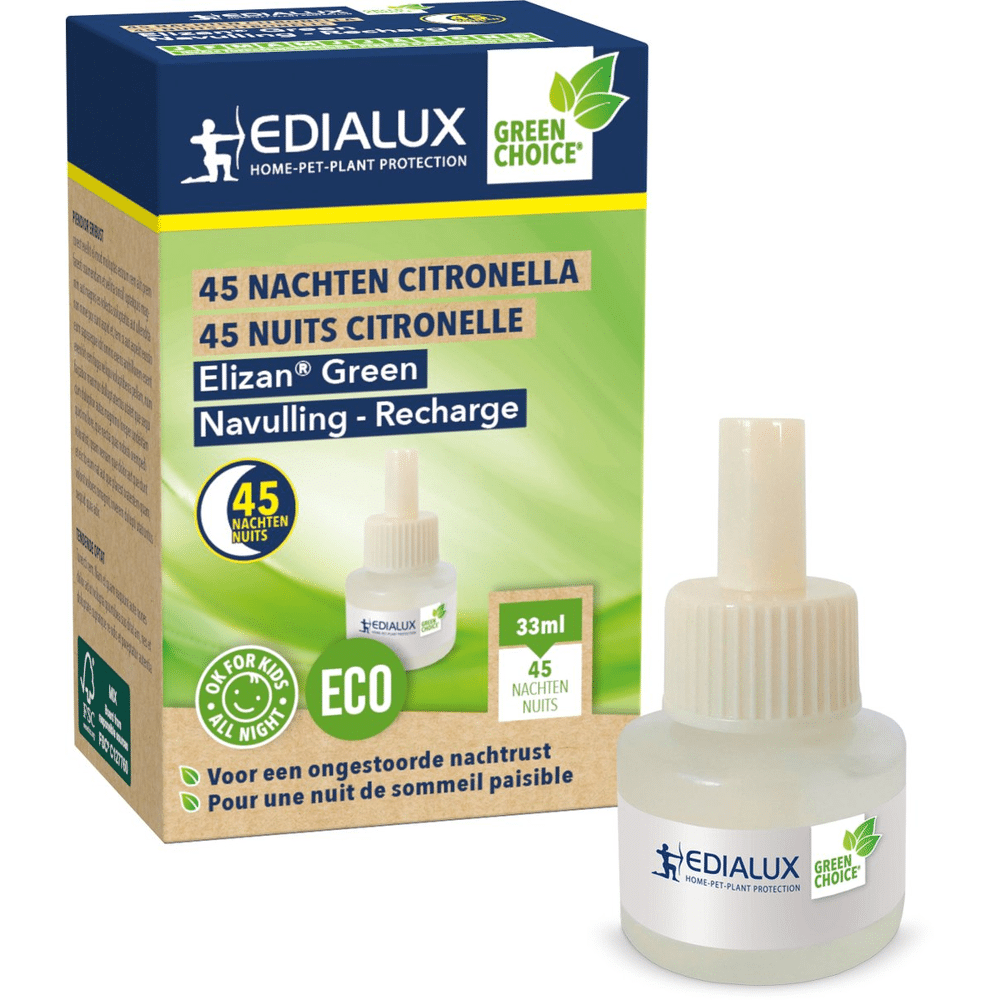 Elizan® Green navulling met Citronella en 4 andere etherische oliën, die in de slaapkamer 45 nachten ongestoorde nachtrust garandeert. De verstuiver biedt een ecologisch alternatief voor wie geen gebruik wenst te maken van biocides in de buurt van bijvoorbeeld zwangere vrouwen en kleine kinderen.