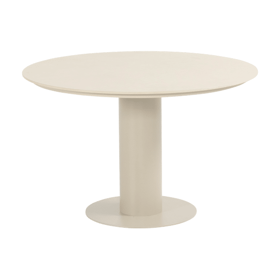 De Girona ronde dining tafel van 120 cm in zandkleur is perfect voor kleinere terrassen. Het keramische blad is krasvast en weerbestendig, terwijl het aluminium frame zorgt voor een lichte, moderne uitstraling.