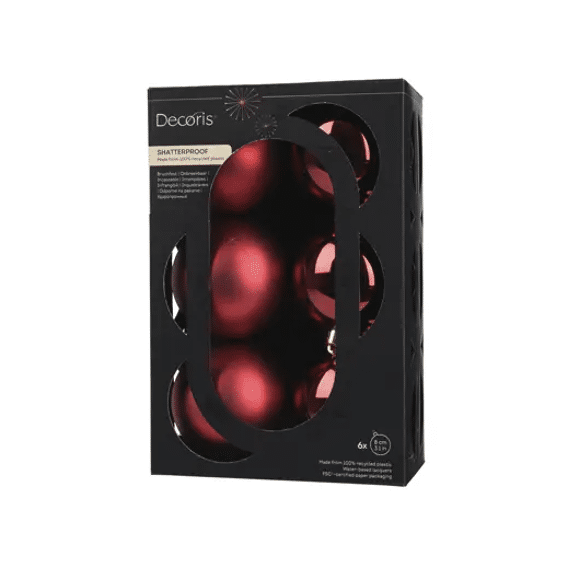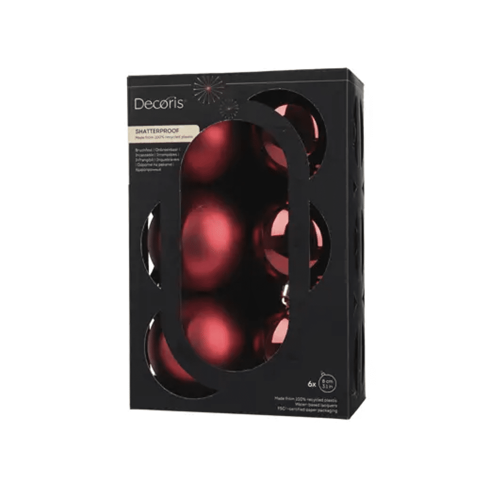 Decoris shatterproof kerstbal ossenbloedDe Decoris shatterproof kerstbal in de kleur ossenbloed is de perfecte aanvulling voor jouw kerstboomdecoratie. Deze prachtige kerstbal heeft een diameter van 8 cm en is gemaakt van polystyreen, waardoor hij niet alleen stevig maar ook vriendelijker voor het milieu is dankzij het gebruik van gerecycled materiaal. - Kleur: Ossenbloed, een rijke rode tint- Materiaal: Polystyreen, gemaakt van gerecycled materiaal- Diameter: 8 cm- Cap kleur: Goud- Cap Type: PS Cap- Afwerking: Glanzend en mat voor een gevarieerde uitstraling- Shatterproof: Ja, ideaal voor huishoudens met kinderen of huisdieren- Verpakking: Plasticvrije verpakking- Manier van ophangen: Met draadDeze kerstbal kan eenvoudig opgehangen worden aan de draad en is een veilige keuze dankzij het shatterproof ontwerp. Voeg een vleugje luxe en duurzaamheid toe aan jouw feestelijke decor met deze veelzijdige kerstbal.