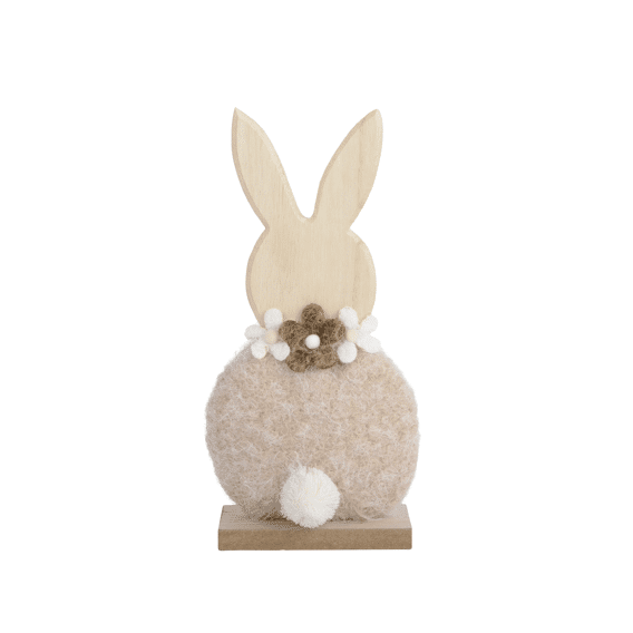 Decoris bruin konijn met bloemenkettingCreëer een warme sfeer in home tijdens rustige momenten met dit charmante decoratief konijn van Decoris. Dit beeldje heeft een vertederende, ronde vorm die perfect in elke ruimte past. Het lichaam is gemaakt van gekookte wol voor een zachte uitstraling, terwijl de houten kop met lange oren subtiel de aandacht trekt. De bruine tinten en de bloemenketting zorgen voor een rustieke, natuurlijke sfeer die je interieur compleet maakt.- Lichtgewicht en gemakkelijk te verplaatsen - Voorzien van een MDF-basis voor stabiliteit - Onderhoudsarm dankzij materialen die eenvoudig af te stoffen zijn - Compact formaat met een hoogte van 24,5 cm, ideaal voor het decoreren van tafels of planken