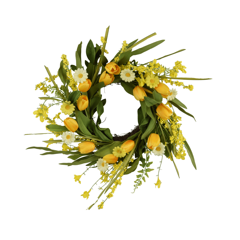 Everlands Krans Tulpen – geel – 55 cm diameter – 10 cm hoogteDeze stralende kunstkrans met gele tulpen en madeliefjes brengt direct sfeer in elke ruimte. De krans heeft een natuurlijke ringvorm met een diameter van 55 cm en een hoogte van 10 cm, gemaakt van duurzaam polyester. Met 40 bladeren en een frisse mix van tulpen en zachte bloemen is dit een onderhoudsarme decoratie in een modern stijl. Dankzij het gebruik van gerecyclede materialen is de krans ook een milieubewuste keuze.• Geen water nodig en gemakkelijk schoon te maken • Blijft mooi en onderhoudsarm, geschikt voor gebruik het hele jaar door • Gemaakt van duurzaam polyester en gerecyclede materialen • Perfect voor een langdurige, natuurlijke uitstraling zonder verwelking Combineer met diversen Everlands-producten voor een indrukwekkende, altijd verzorgde uitstraling.