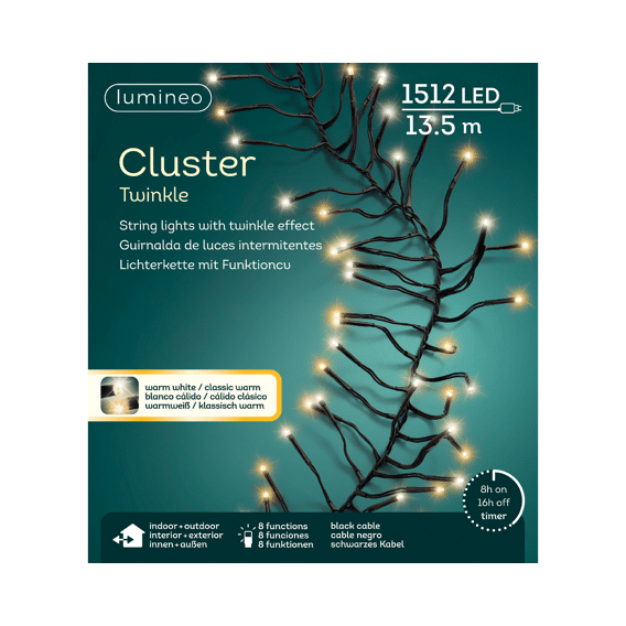 LED cluster - 1350cm - 1512 LED - twinkel - 8 functies - binnen & buiten - zwart/warm wit/klassiek warm