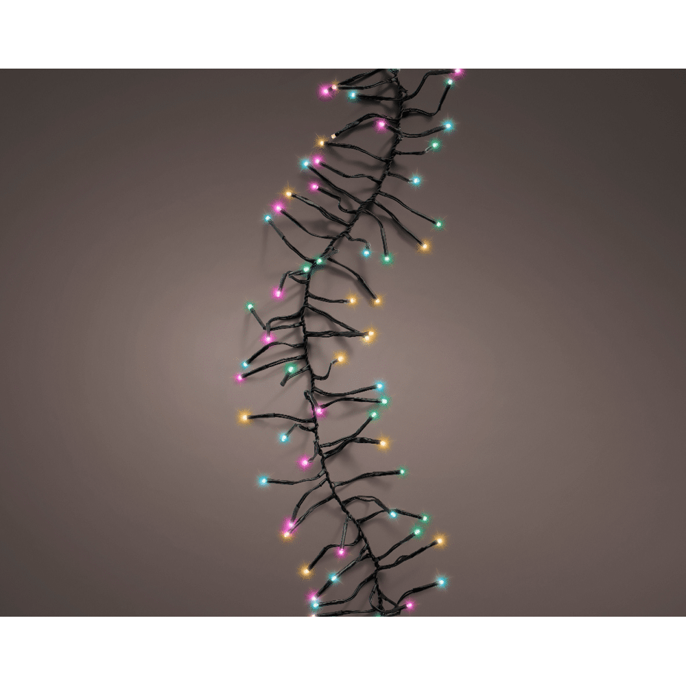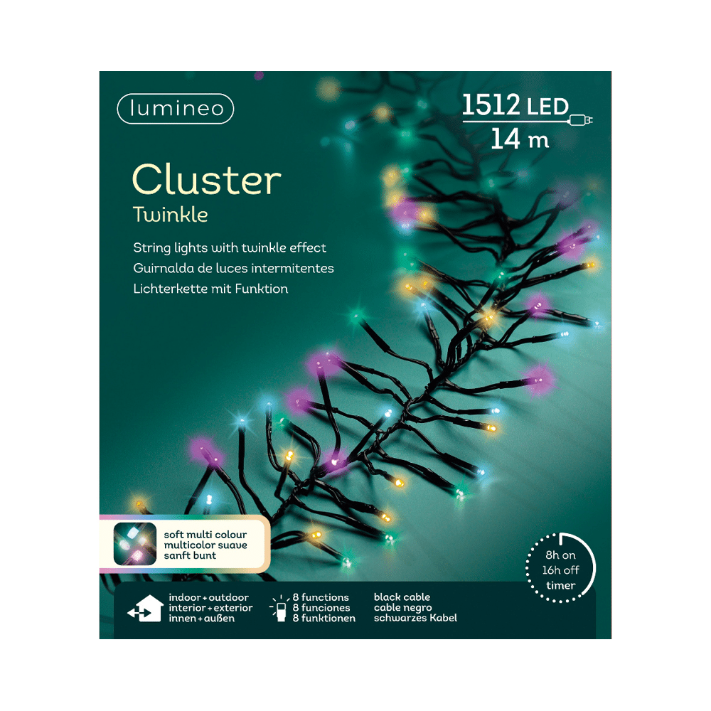 Lumineo Boomverlichting Cluster zacht Multi 1400 cmCreëer een magische kerstsfeer met de Lumineo Boomverlichting Cluster in zachte multikleuren. Deze feestelijke verlichting is ontworpen om je kerstboom binnen enkele ogenblikken te transformeren met zijn schitterende 8 functies Twinkle effect.- Lengte van 1400 cm, ideaal voor grote bomen- Voor buiten én binnenshuis, met duurzame PVC-materialen- 1512 LED-lampjes met compacte 0,9 cm tussenruimte- Zwarte kabel, gemakkelijk te camoufleren in takken- Inclusief handige 8-uurs timer voor moeiteloos gebruikDe fijne 3mm LED's zorgen voor een subtiele maar betoverende uitstraling. Met een energie-efficiënte stekker zorgt deze boomverlichting ervoor dat jouw feestdagen stralen zonder zorgen over batterijen. Perfect voor wie houdt van een klassieke kerstboom met een moderne toets. Laat jouw kerstboom opvallen met de Lumineo Clusterverlichting en geniet van de warme, vrolijke feestdagen.