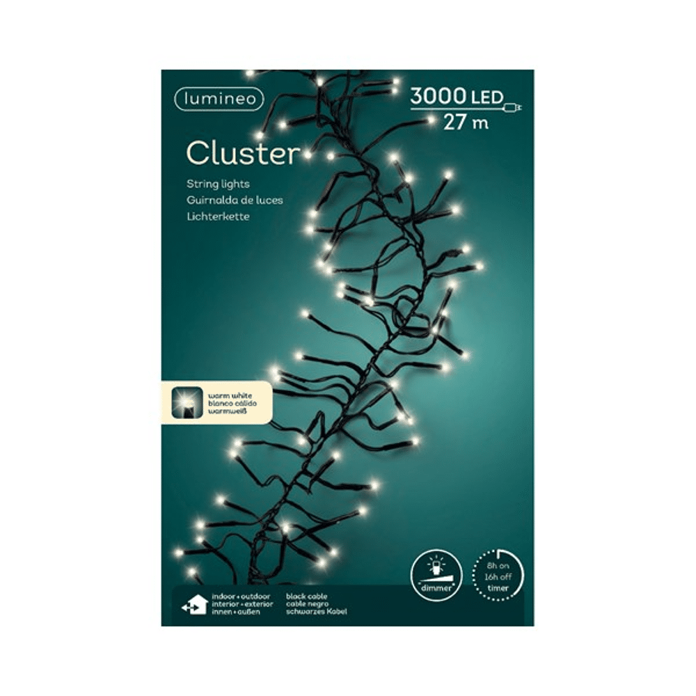 Creëer een betoverende kerstsfeer met de Lumineo LED cluster verlichting warm wit 2800 cm. Met 3000 warm witte LED’s (3mm) die slechts 0,9 cm van elkaar geplaatst zijn, ontstaat een volle en sfeervolle uitstraling.