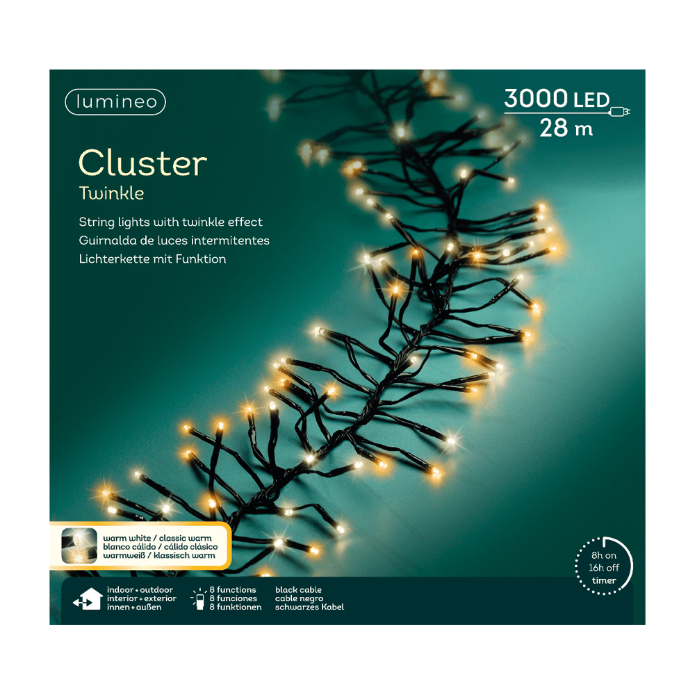Breng een sfeervolle verlichting aan met deze LED clusterverlichting van 2800 cm en 3000 LED's in een mix van warm wit en klassiek warm licht. De zwarte kabel zorgt voor een moderne, subtiele look. Dankzij de 8 verlichtingsfuncties, waaronder een twinkel effect, is deze verlichting ideaal voor zowel binnen als buiten. Perfect om je tuin, woning of kerstboom te versieren tijdens de feestdagen.