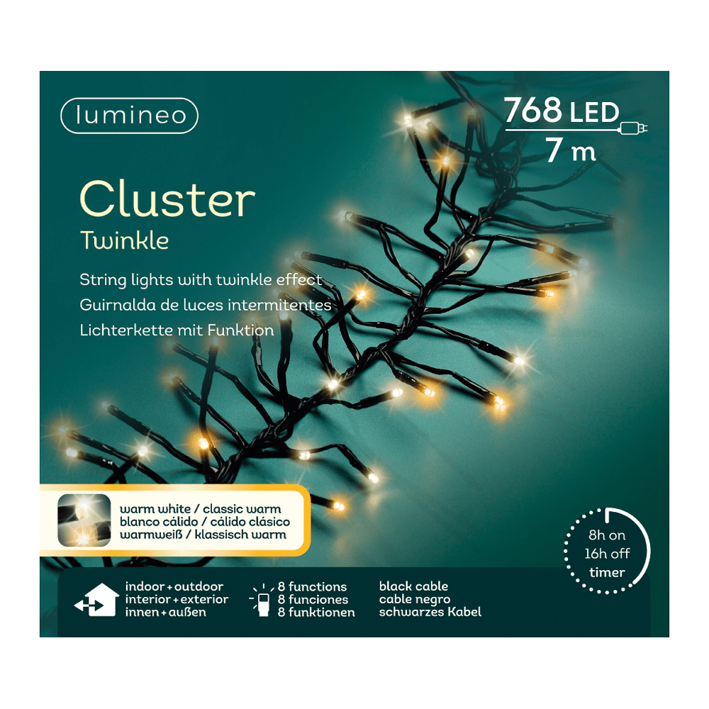 LED cluster - 600cm - 768 LED - twinkel - 8 functies - binnen & buiten - zwart/warm wit/klassiek warm