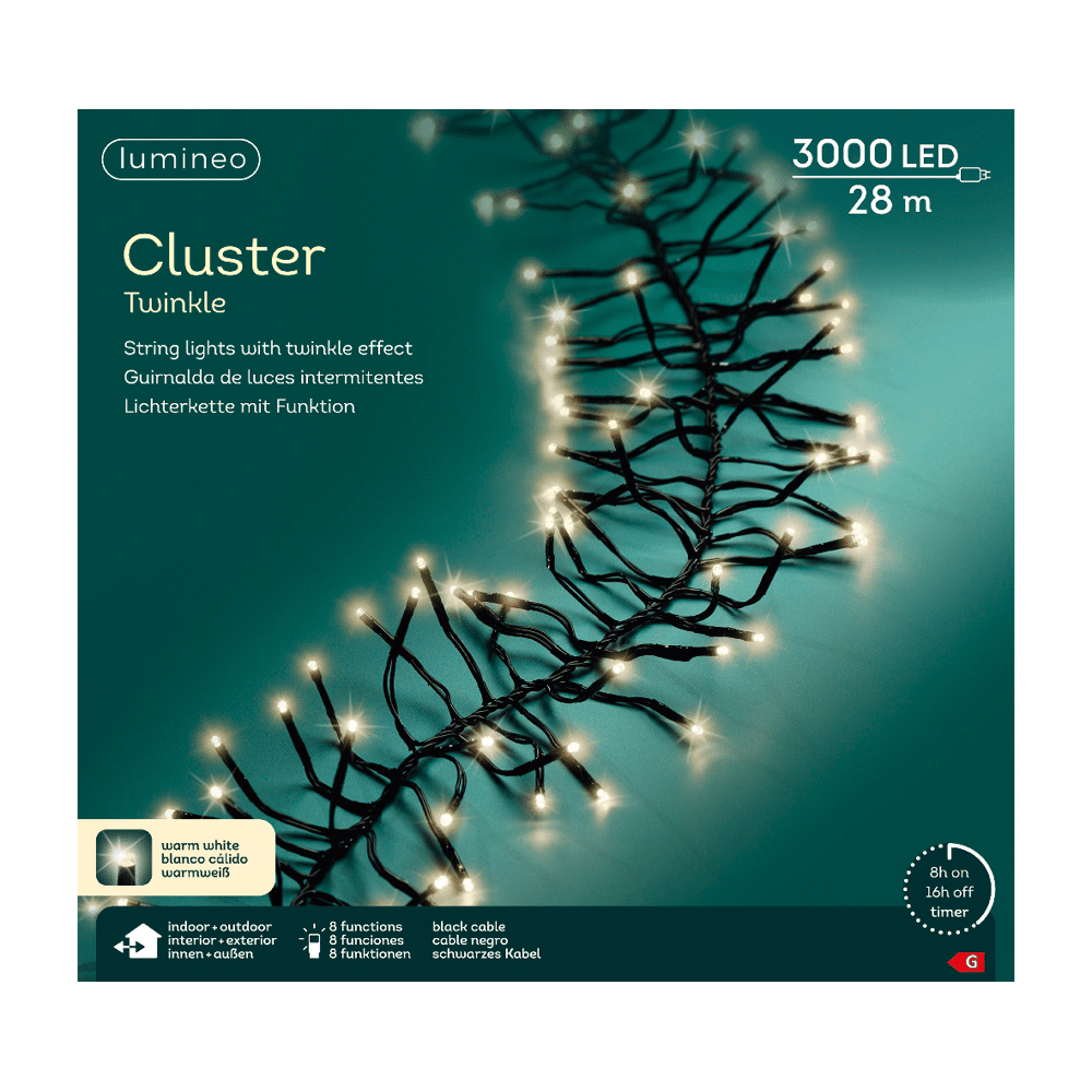 - **NOT FOUND** key: product.notifyMeModalProduct LED cluster lights 8 functie twinkel effect binnen & buiten - L.2800cm - 3000 LED - zwart/warm wit