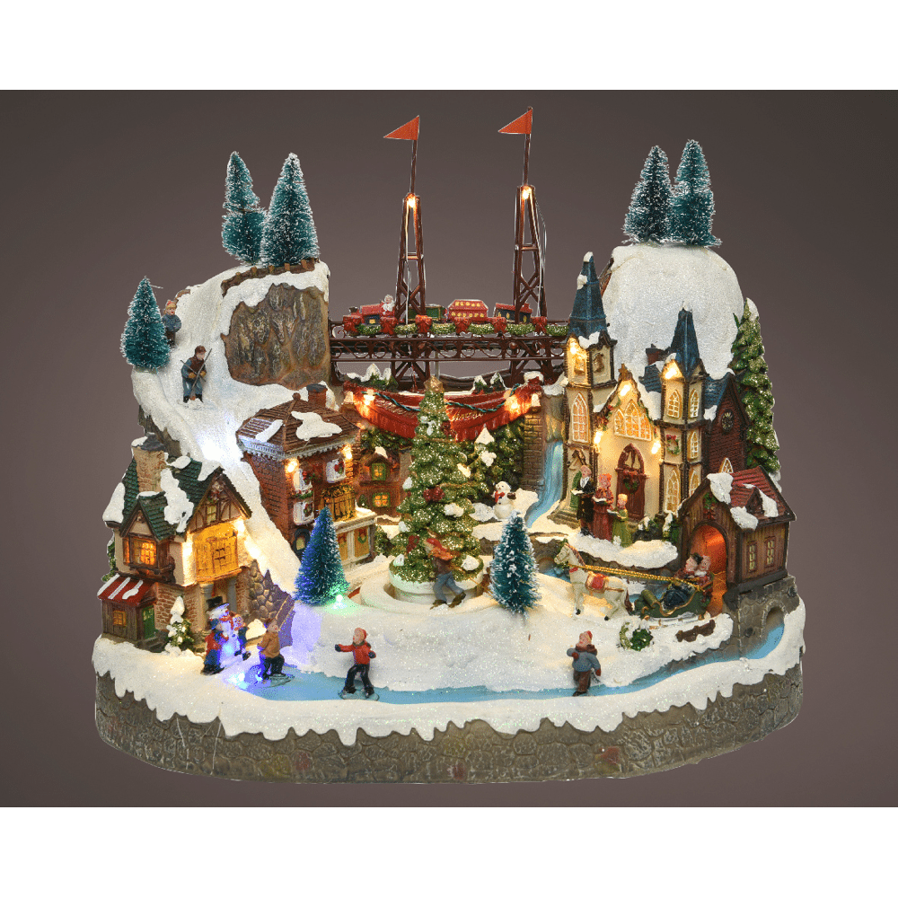 Dit uitgebreide winterdorpstafereel bruist van het leven en de gezelligheid. Terwijl kinderen schaatsen op de vijver en bewoners zich verzamelen rond de kerstboom, rijdt boven het dal een trein over de brug. De verlichte huizen, de arrenslee en de gedetailleerde berghellingen maken dit decorstuk tot een magische blikvanger. Dankzij de sfeervolle LED-verlichting komt dit winterse dorp volledig tot leven in je kerstcollectie.