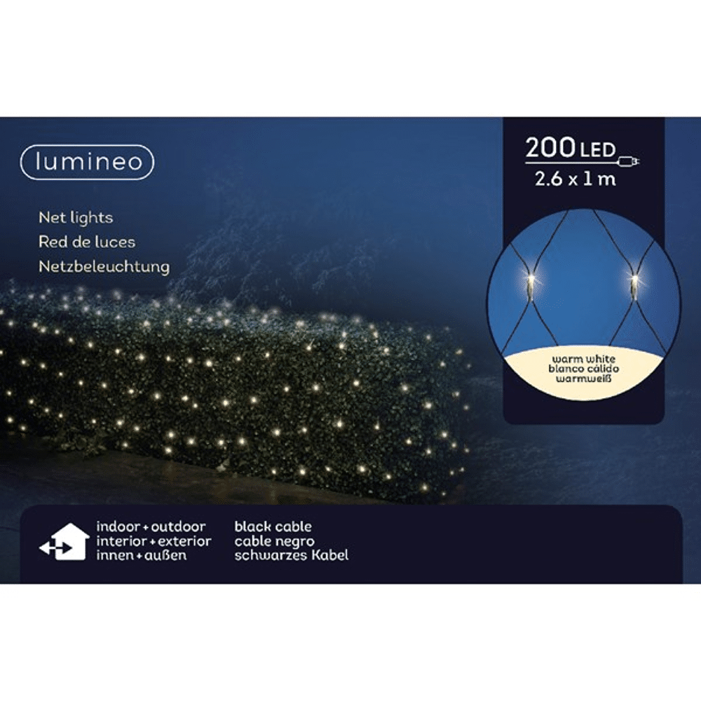 Lumineo netverlichting Warm Wit 260 cmPerfect voor het creëren van een warme en feestelijke sfeer, deze netverlichting is ideaal voor jouw buitenruimte. Dankzij de afmetingen van 260 cm x 100 cm kan je met deze verlichting eenvoudig een opvallend lichteffect bereiken.- 200 warm witte LED-lichtjes voor een sprankelende uitstraling- Stevige PVC-constructie met een zwarte kabel voor een subtiel uiterlijk- Geschikt voor buitenshuis, waardoor het perfect is voor het verlichten van je tuin of gevel- De lampen zijn constant aan, zonder knipperende effecten, wat zorgt voor een rustige ambiance- Uitgerust met een timerfunctie van 8 uur, voor moeiteloze bedieningDe netverlichting heeft een afstand van 13 cm tussen de LED-lichtjes en is voorzien van een stekker als stroombron, waardoor je geen batterijen nodig hebt. Je kunt hiermee eenvoudig jouw buitenomgeving verlichten en er een magisch geheel van maken dit seizoen. De eenvoudige installatie van deze netverlichting zorgt ervoor dat jouw feestdecoratie in een handomdraai compleet is. Laat je creativiteit de vrije loop en maak van jouw buitenruimte een sfeervol geheel!