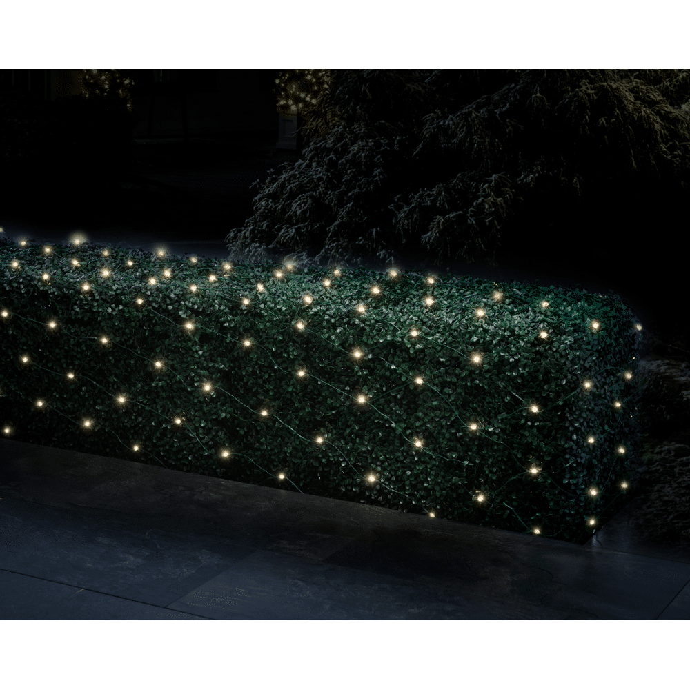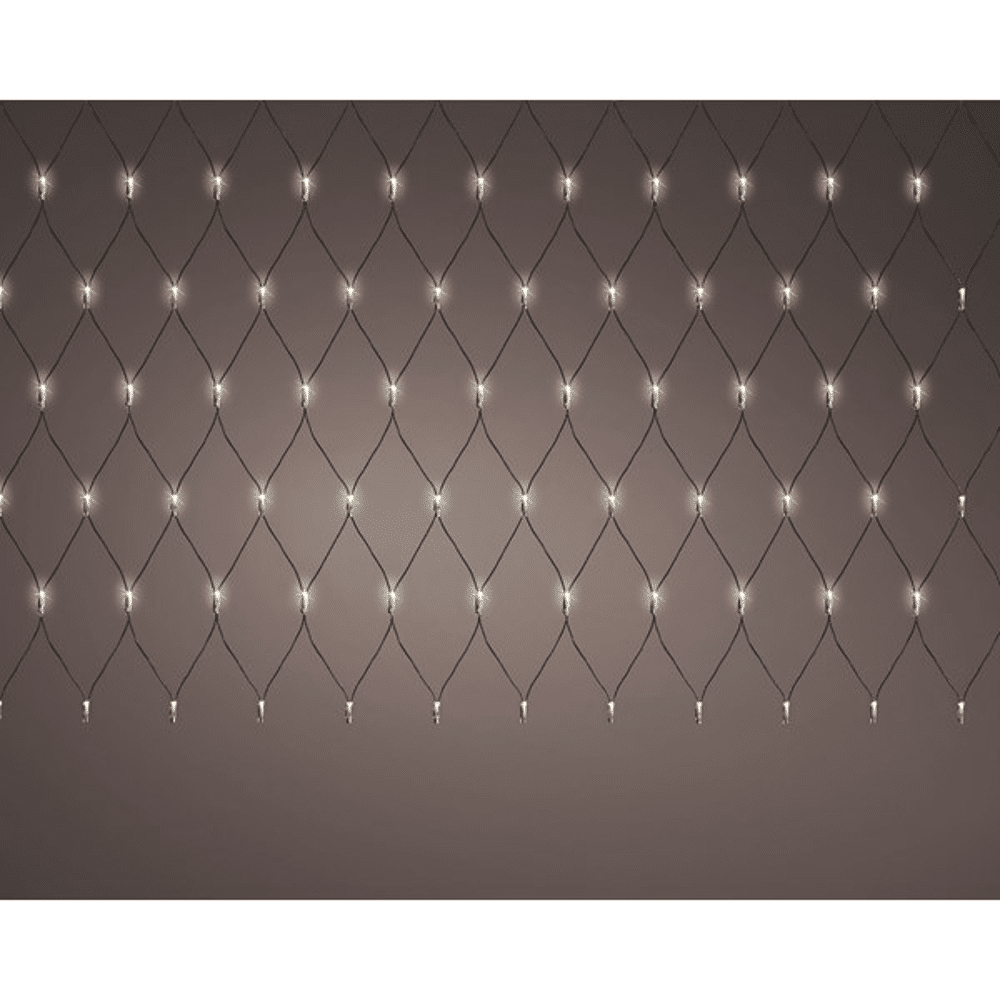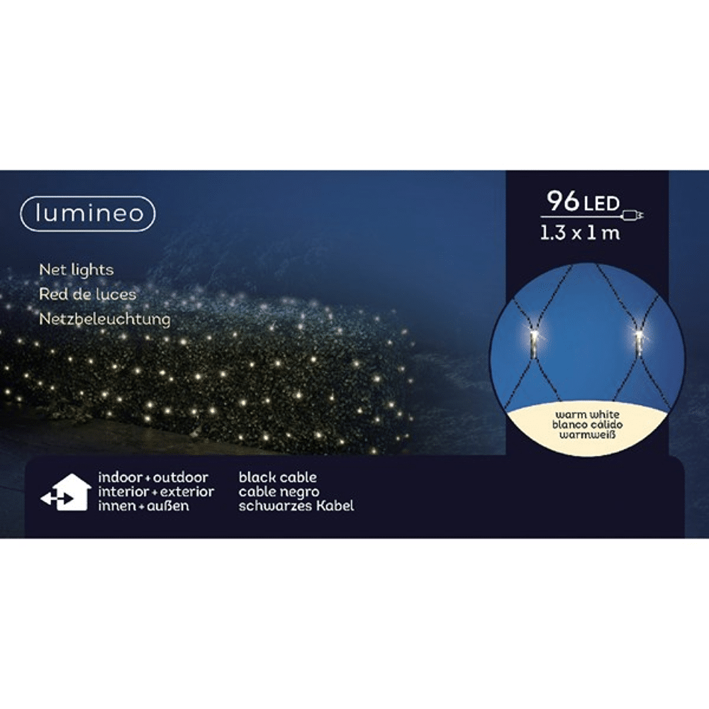 Lumineo netverlichting Warm Wit 130 cmMet de Lumineo netverlichting tover je jouw buitenruimte om tot een feestelijk spektakel! Deze elegante verlichting is perfect voor het verlichten van gevels en creëert een warme kerstsfeer waar je van zult genieten.- Vervaardigd van duurzaam pvc, in een handige afmeting van 130 cm in breedte en 100 cm in hoogte- Uitgerust met 96 warm witte LED lampjes van 3mm voor een prachtige constante verlichting - De zwarte kabel zorgt voor een stijlvolle uitstraling die moeiteloos opgaat in iedere omgeving- Elke lampje staat op een afstand van 13 cm waardoor ze prachtig gelijkmatig verlicht zijn- Voorzien van een handige 8-uurs timerfunctie waardoor de verlichting automatisch aan- en uitgeschakeld wordtDeze netverlichting is ontworpen voor buiten gebruik en kan eenvoudig op elke gevel bevestigd worden. Geniet zorgeloos van de feestdagen zonder je druk te maken om het uitschakelen van de lampjes. Met de Lumineo netverlichting geef je jouw buitenruimte de warme gloed en feestelijke uitstraling die het verdient!