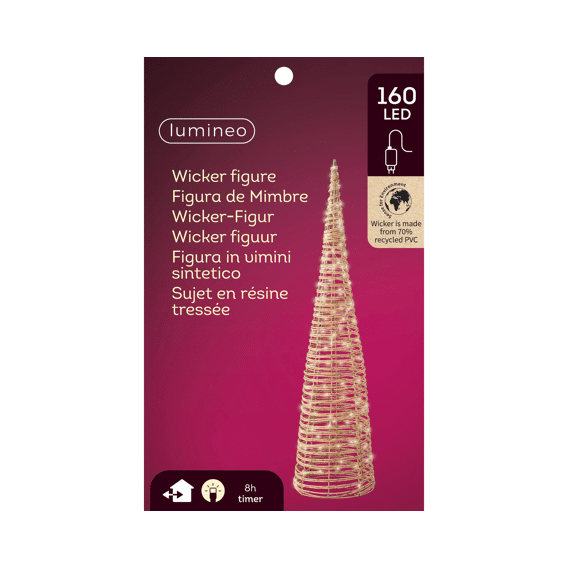 De Lumineo LED kegel heeft een hoogte van 90 cm en een diameter van 23 cm, en is voorzien van 160 micro LED-lampjes in warm wit. Deze verspreiden een zachte, constante gloed (steady-functie) die rust en gezelligheid uitstraalt. De transparante kabel van 500 cm maakt plaatsing eenvoudig, terwijl de stekker-voeding zorgt voor een betrouwbare werking zonder batterijen.