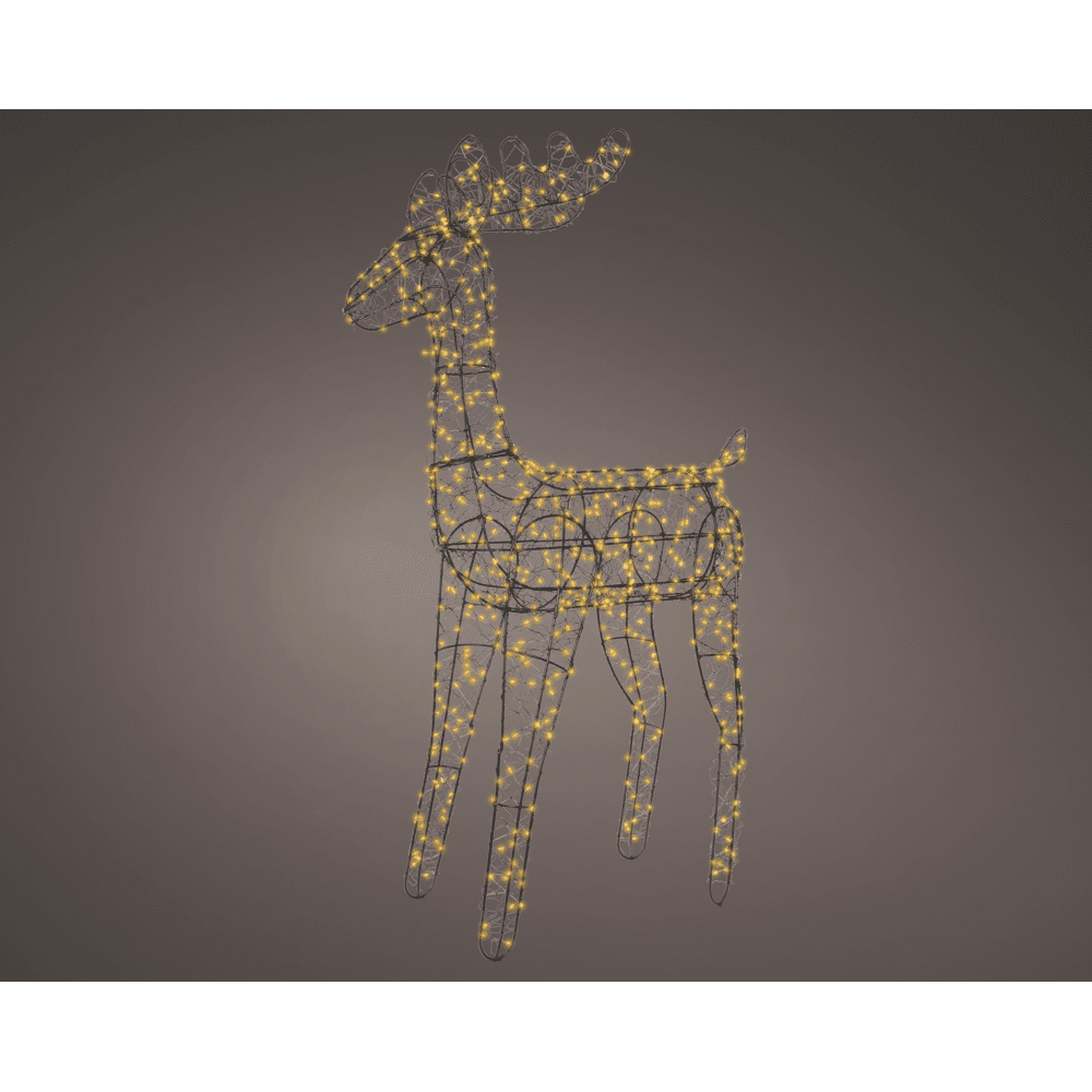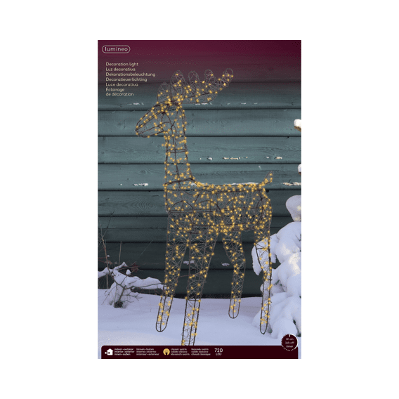 Het rendier is vervaardigd uit stevig, weerbestendig metaal en daardoor ideaal geschikt voor buitengebruik. Met afmetingen van L 58 × B 18,5 × H 84 cm vormt het een opvallend maar stijlvol accent in de tuin, op het terras of bij de voordeur. De 720 micro LED-lampjes creëren een sfeervolle lichtverspreiding, en dankzij de 500 cm lange zwarte aansluitkabel plaats je het figuur eenvoudig op de perfecte plek. De stekker-voeding en de ingebouwde 8-uurs timerfunctie maken het gebruik extra praktisch en energiezuinig.