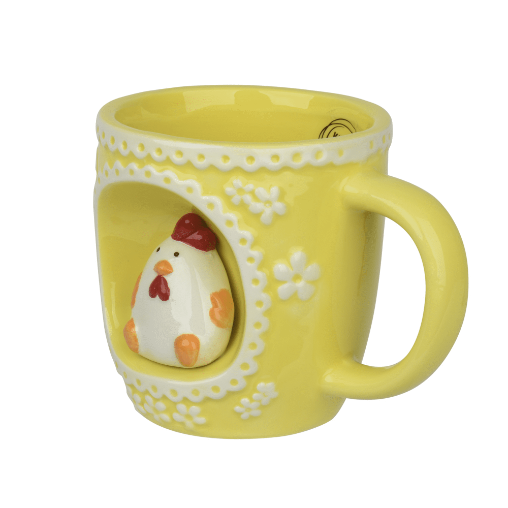 Kitchen Goods geel mok met kipdecoratie, 14x10x10 cmBreng warmte en vrolijkheid in je coffee-moment met deze geel mok van Kitchen Goods. De mok is gemaakt van geglazuurd dolomiet en heeft een charmante kipdecoratie die subtiel opvalt en zo een speelse uitstraling geeft. De frisse geel kleur en de delicate bloemenpatronen maken dit item perfect om zonnige accenten toe te voegen aan je tafelaankleding. Het stevige, comfortabele oor zorgt ervoor dat je de mok gemakkelijk vasthoudt tijdens je ontspannende pauze.- Gemaakt van geglazuurd dolomiet - Afmetingen: 14 cm lang, 10 cm breed, 10 cm hoog - Voedselveilig materiaal - Geschikt voor binnen