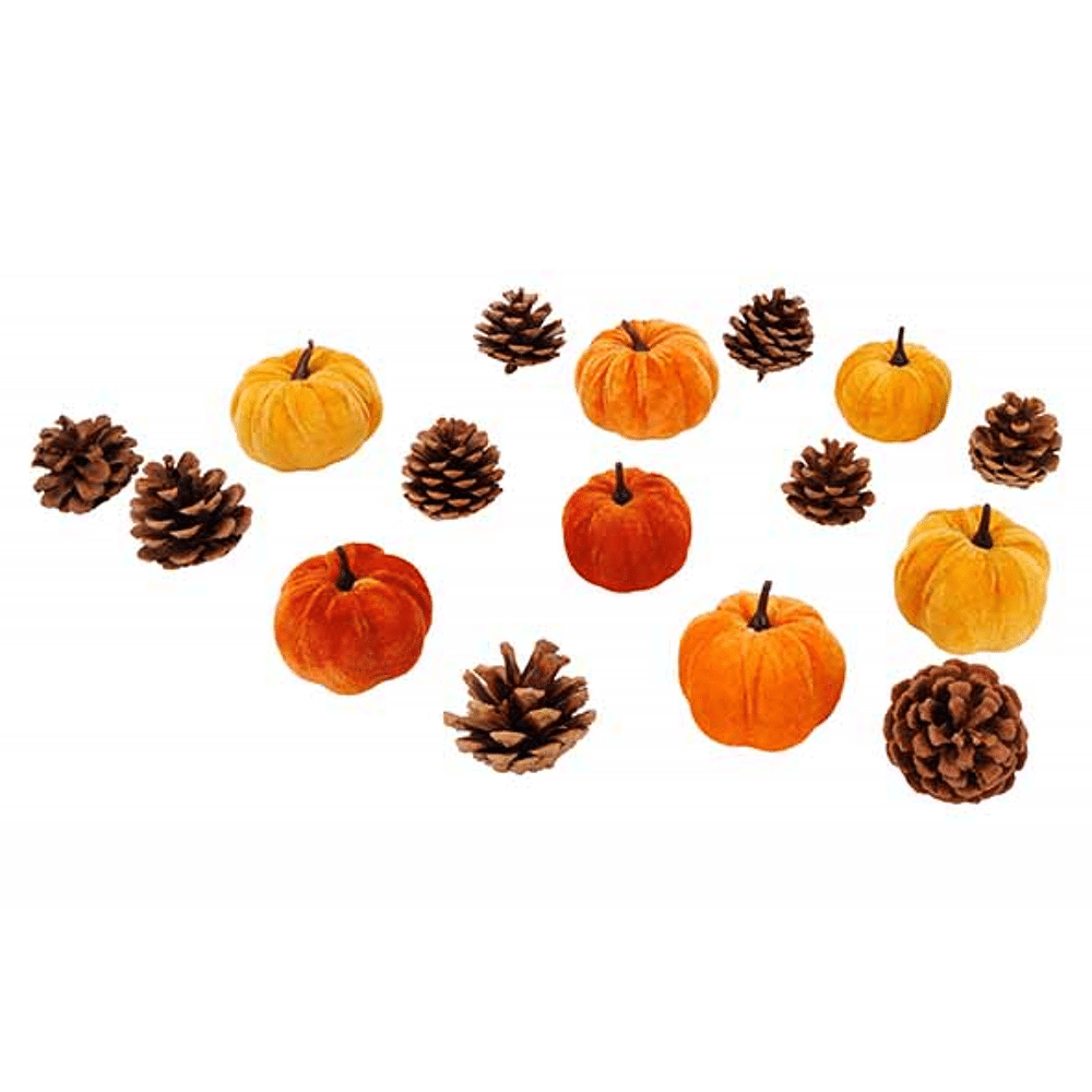 Pompoen set 16 mix with cones oranje d5 2 0x20xh12cm