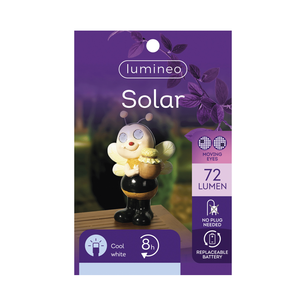 Lumineo Solar Tuinfiguur Bij in Speelse MulticolorDit speelse Lumineo tuinfiguur in de vorm van een bij brengt een vrolijke sfeer in je tuin, balkon of terras. Dankzij de solar-aandrijving werkt het licht volledig op solar energie, wat zorgt voor gemakkelijk gebruik zonder gedoe met snoeren. De SMD LED koel wit verlichting met 104 lichtpunten zorgt voor een frisse uitstraling en een heldere lichtbeleving tot wel 8 uur. Het duurzame polyresin heeft levendige kleuren, waardoor het figuur niet alleen stijlvol maar ook weerbestendig is.Voordelen:• Werkt op solar energie – duurzaam en eenvoudig in gebruik • Vrolijk ontwerp met speelse multicolor accenten • koel wit LED-licht voor een frisse, heldere sfeer • Vervangbare batterij voor langdurig plezier