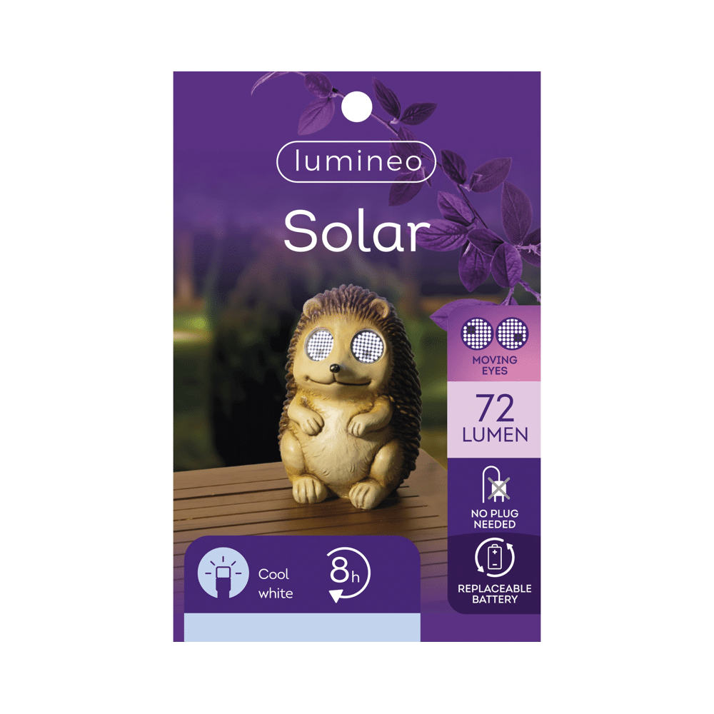 Lumineo Solar Egel Tuinfiguur met Koel Wit Licht Een charmante toevoeging aan je tuin, balkon of terras die een speelse sfeer creëert met koel wit licht. Deze solar egel, gemaakt van duurzaam polyresin, werkt volledig op solar energie en is voorzien van 104 SMD LED's die tot 8 uur lang schijnen. Dankzij de meegeleverde vervangbare Li-ion batterij blijft het licht langdurig helder. Het object combineert gebruiksgemak met een vrolijke uitstraling, waardoor het ideaal is om buitenruimtes te verlichten zonder gedoe met kabels.Voordelen: • Volledig solar, dus milieuvriendelijk en draadloos • Langdurige verlichting tot 8 uur per lading • Vervangbare batterij voor langdurig gemak • Duurzaam polyresin materiaal met een speels ontwerp