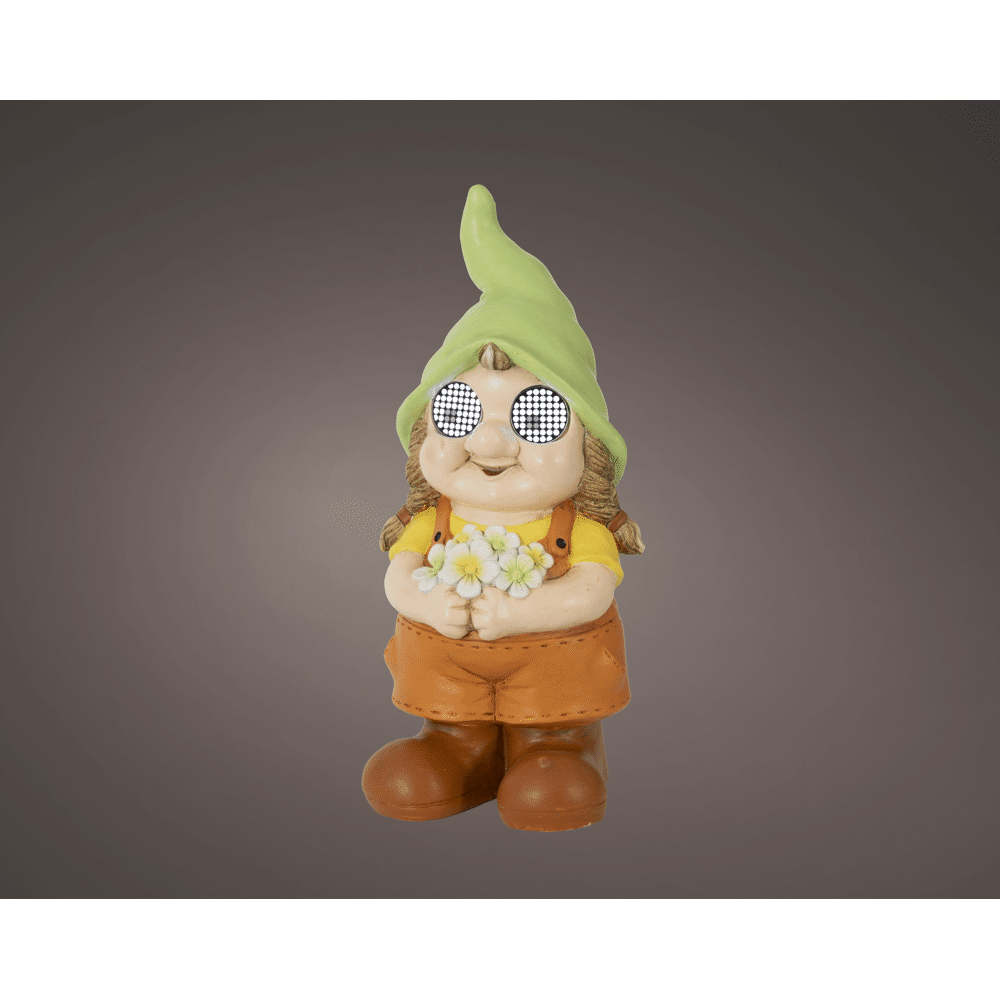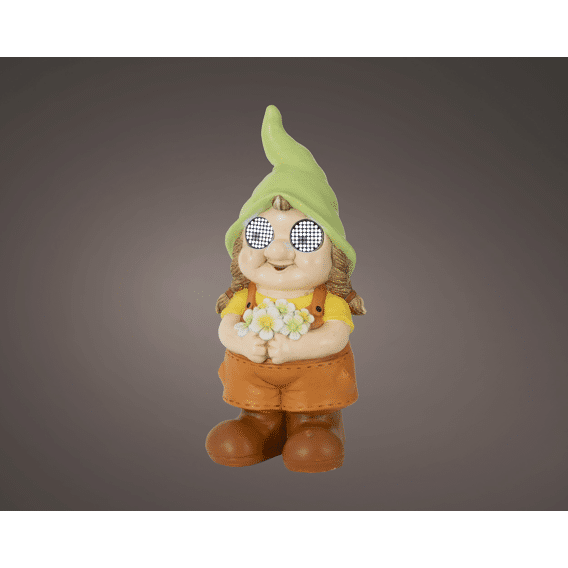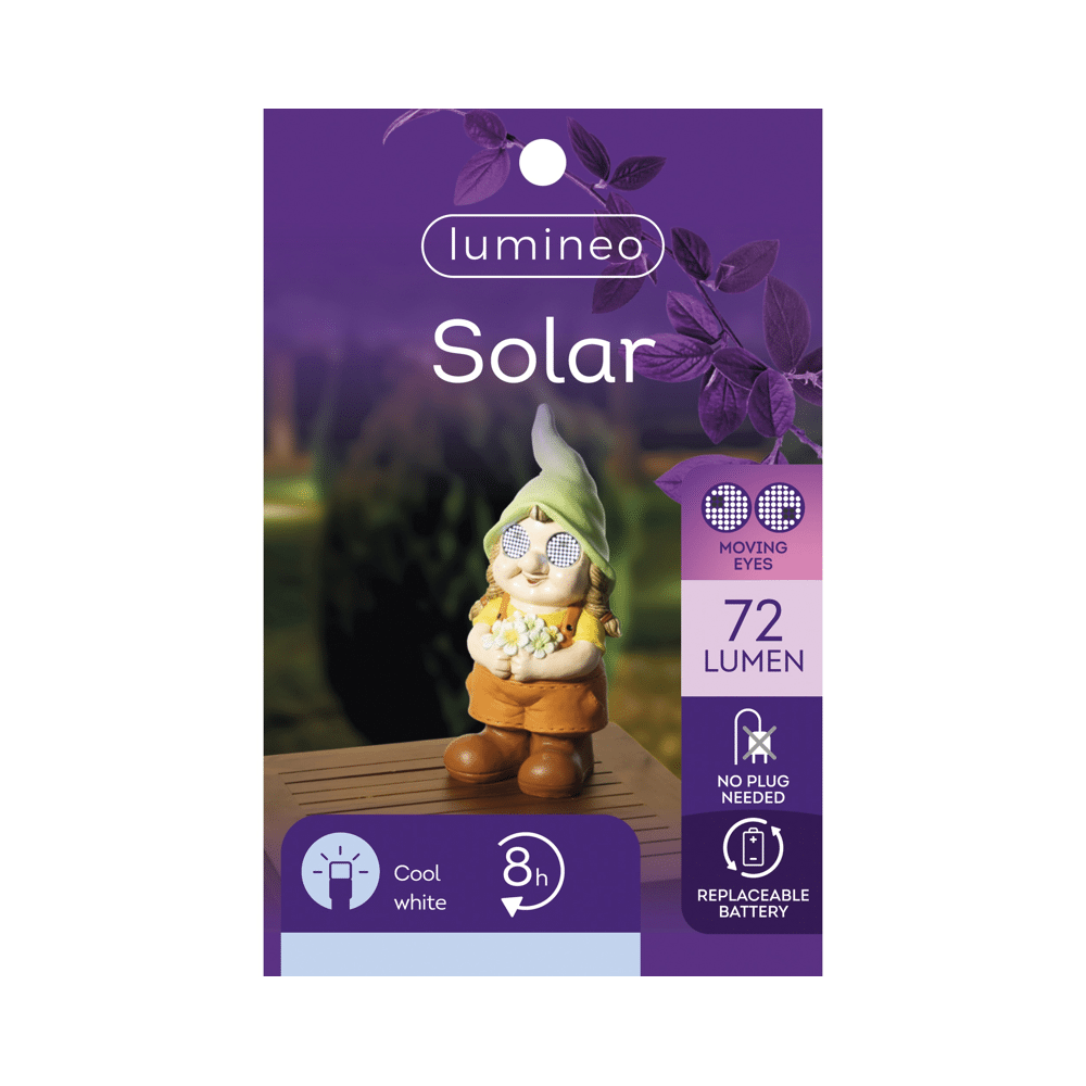 Lumineo Solar Tuinbeeld Kaboutervrouw in Kleurrijk Design Een vrolijk tuinbeeld dat de ogen laat sparkle met koel wit LED-licht, perfect voor een zonnige sfeer op het terras, balkon of in de tuin. Dit kleurrijke figuurtje van duurzaam polyresin combineert speelsheid met gemak dankzij solar energie en de ingebouwde Li-ion batterij die tot 8 uur werktijd biedt. Met 104 SMD-LED’s zorgt het voor een helder, static licht dat moeiteloos bijdraagt aan een comfortabele en sfeervolle buitenomgeving. Het compact formaat en de vervangbare batterij maken het tuinbeeld eenvoudig te plaatsen en te onderhouden. Voordelen: • Draadloos dankzij solar energie met vervangbare batterij • koel wit LED-licht voor een frisse en heldere uitstraling • Duurzame polyresin afwerking in levendige, veelkleurige tinten • Eenvoudig te plaatsen en lange werktijd tot 8 uur
