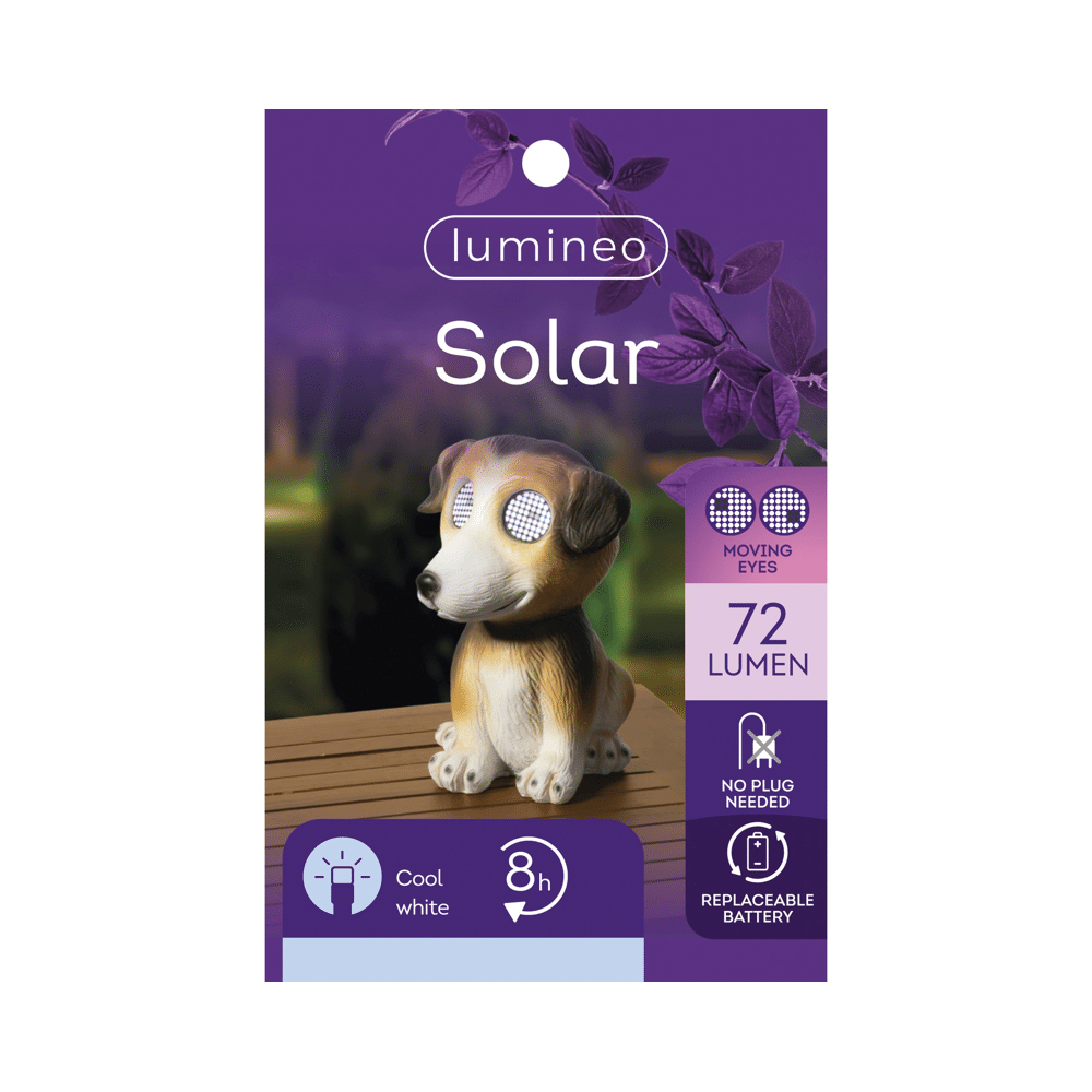 Lumineo Solar Tuinfiguur Hond met LED-licht in koel witEen vrolijke toevoeging aan je tuin, balkon of terras die een speelse en charmante sfeer creëert. Dit kleurrijke hondenfiguur van polyresin werkt volledig op solar energie, met een ingebouwde Li-ion batterij die eenvoudig te vervangen is en tot 8 uur koel wit SMD LED-licht biedt. Dankzij het gebruiksvriendelijke ontwerp en duurzame materialen voegt deze lamp functioneel gezelligheid toe aan elke buitenruimte. Het compact formaat zorgt voor een subtiele maar opvallende aanwezigheid, zowel overdag als 's avonds te bewonderen.Voordelen:• Draadloos en milieuvriendelijk dankzij solar energie• Langdurige verlichting tot 8 uur na opladen• Speels hondenontwerp met aantrekkelijke kleurdetails• Gemakkelijk te plaatsen en batterij vervangbaar voor langdurig plezier