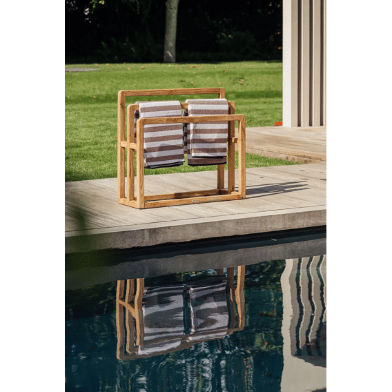Deze stijlvolle towel rack in gerecycleerd teak combineert functionaliteit met natuurlijke elegantie. Dankzij het strakke, open frame en de warme houttinten is dit handdoekenrek een verfijnde toevoeging aan je terras, zwembadomgeving of wellnessruimte.