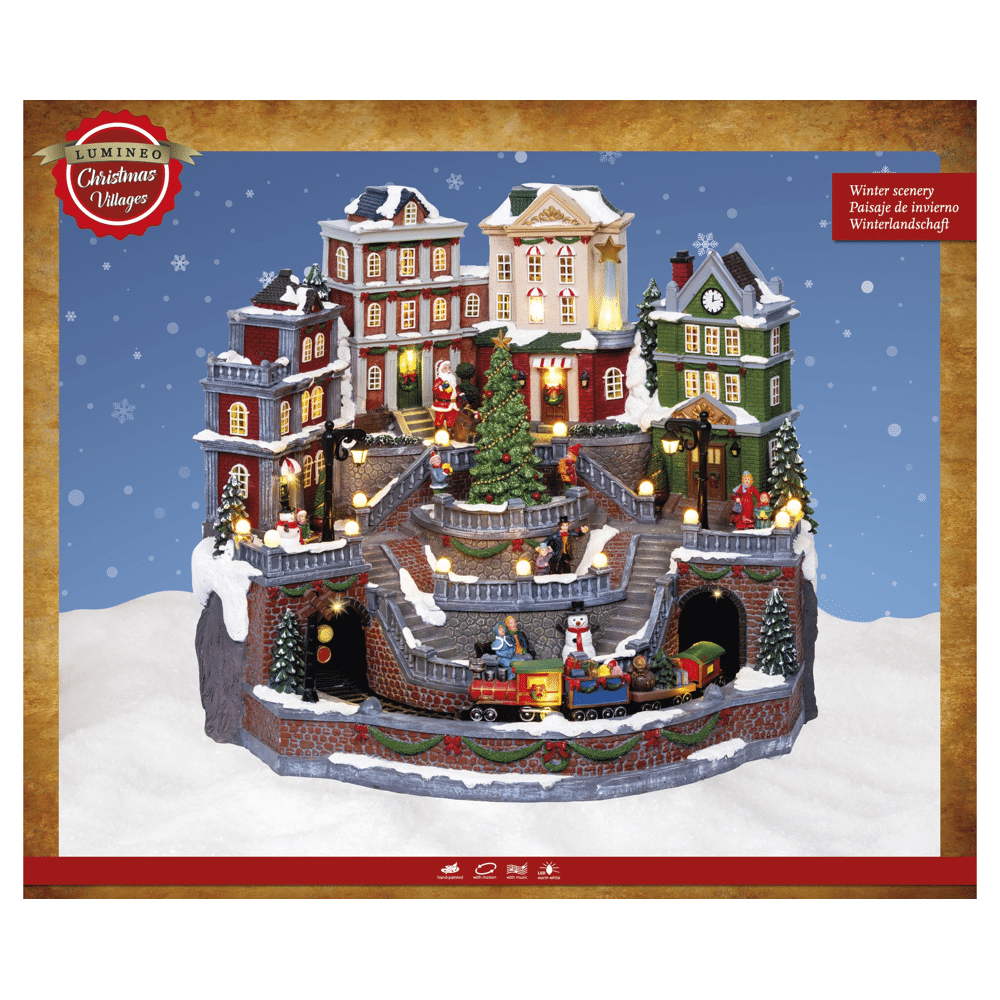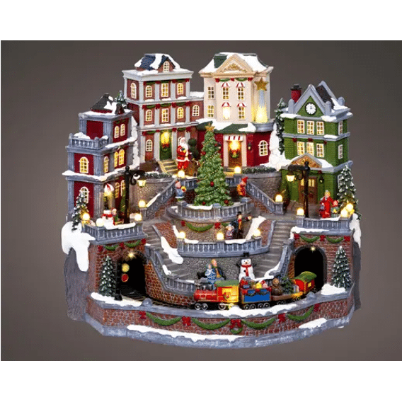 Verlicht Kerstdorp met Trein – Polyresin – Warm Wit LED – 41 × 46 × 37,5 cm – Stekker