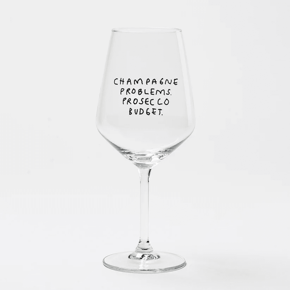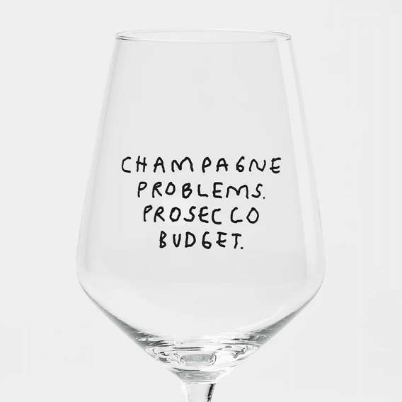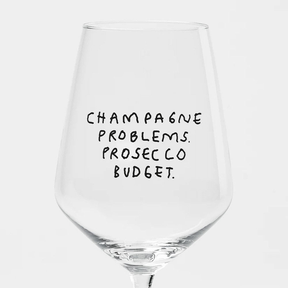 Wijnglas met de inscriptie "Champagne Problemen. Prosecco Budget." Uw nieuwe partner voor Spritz, witte wijn, rode wijn en rosé. Uit de gezamenlijke collectie van illustrator Johanna Schwarzer uit Offenbach & selekkt.